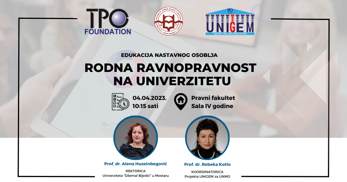 Predavanje sa radionicom i diskusijom ”Rodna ravnopravnost na univerzitetu” za nastavno osoblje – članove i članice Timova za osiguranje kvaliteta Pravnog, Ekonomskog, Nastavničkog i Fakulteta humanističkih nauka Univerziteta “Džemal Bijedić” u Mostaru te univerzitetskih studija Poslovna informatika, Dizajn interijera i Studij turizma, u okviru UNIGEM projekta.