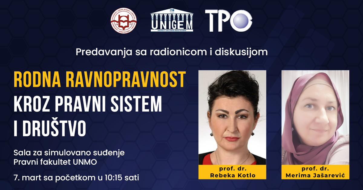 Povodom obilježavanja 8. marta – Međunarodnog dana žena, u okviru UNIGEM projekta, na Univerzitetu “Džemal Bijedić” u Mostaru održana su predavanja sa radionicom i diskusijom pod nazivom: „Rodna ravnopravnost kroz pravni sistem i društvo".
