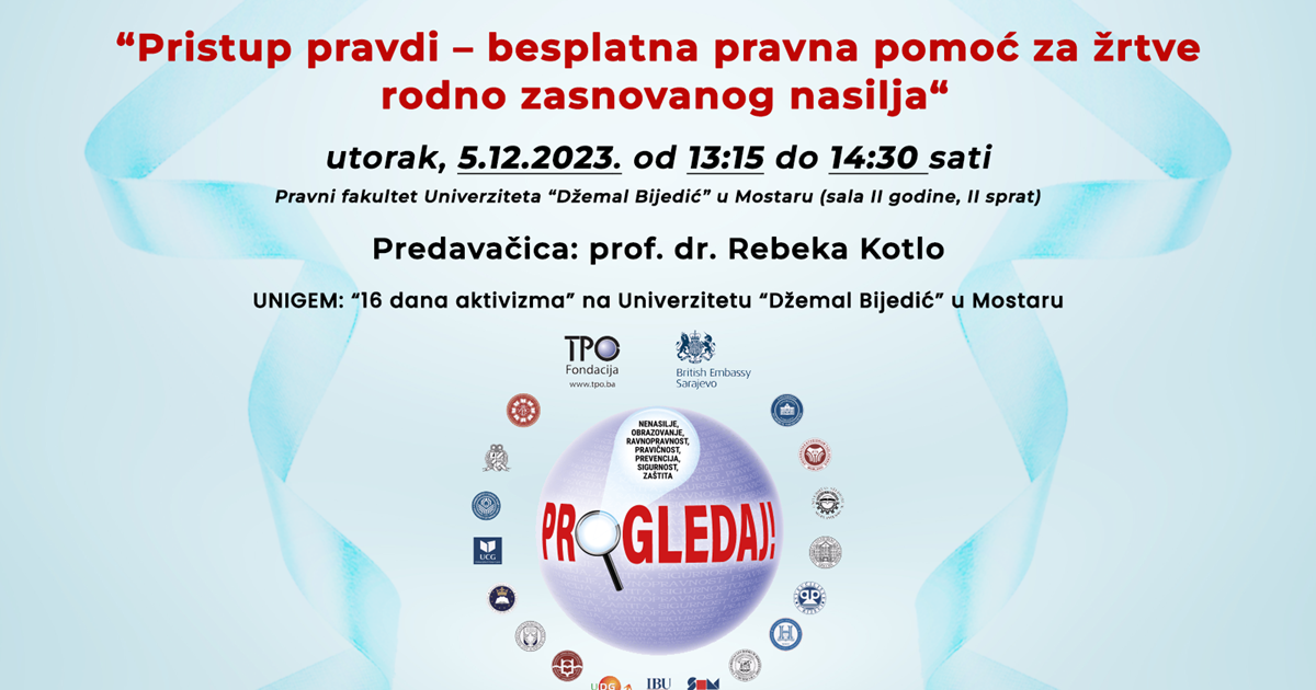 Predavanje sa diskusijom "Pristup pravdi - besplatna pravna pomoć za žrtve rodno zasnovanog nasilja" predstavlja prvi u nizu događaja u okviru kampanje "16 dana aktivizma" koju zajednički provode Univerzitet "Džemal Bijedić" u Mostaru i TPO Fondacija.