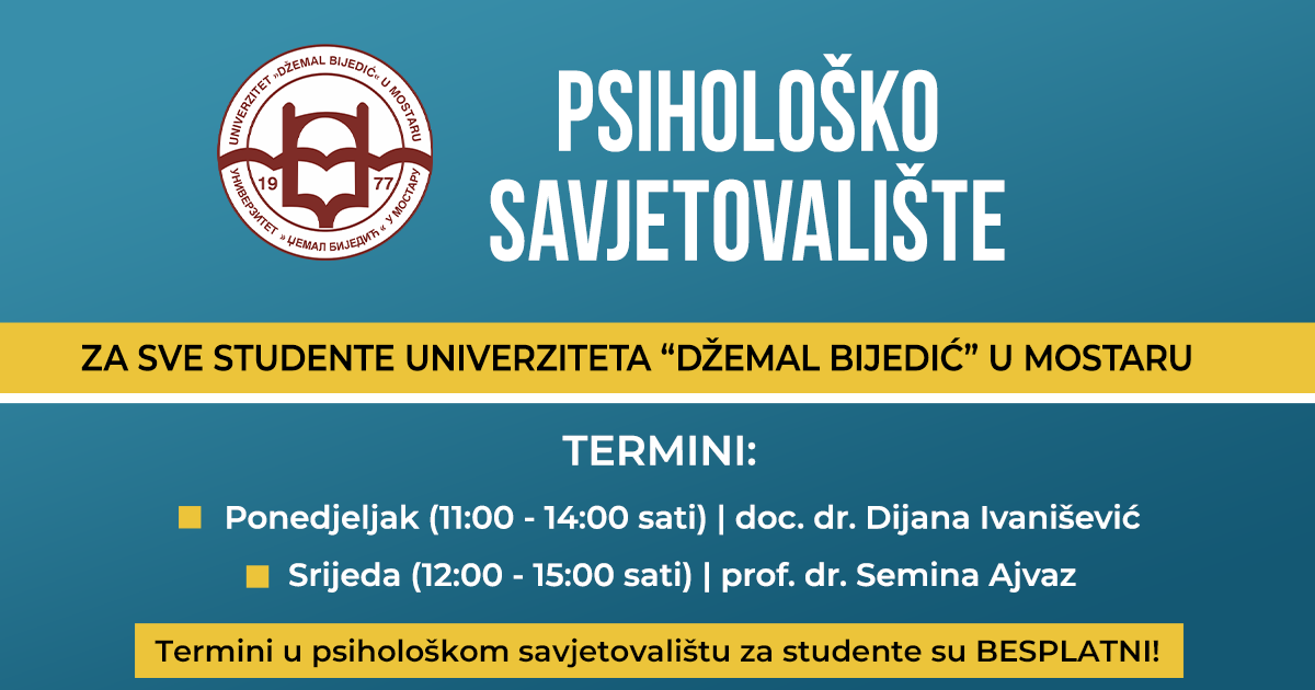 Psihološko savjetovalište nudi besplatne usluge savjetovanja i podrške za sve studente Univerziteta „Džemal Bijedić“ u Mostaru s ciljem rješavanja ličnih, emocionalnih i akademskih izazova uz stručnu pomoć i podršku.