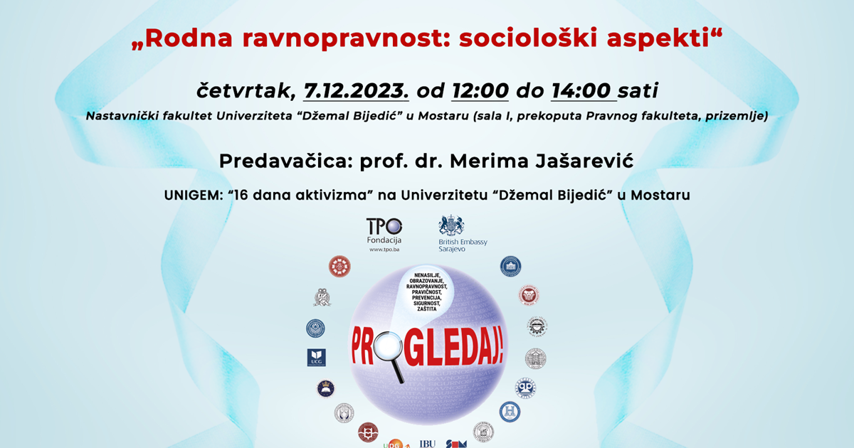 Predavanje sa radionicom „Rodna ravnopravnost: sociološki aspekti“ kao četvrti događaj u okviru obilježavanja kampanje "16 dana aktivizma" koju zajednički provode Univerzitet "Džemal Bijedić" u Mostaru i TPO Fondacija će biti održano u četvrtak, 7. decembra 2023. godine na Nastavničkom fakultetu Univerziteta „Džemal Bijedić“ u Mostaru (zgrada prekoputa Pravnog fakulteta) u trajanju od 12:00 do 14:00 sati.