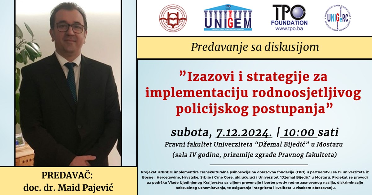 Predavanje na temu ”Izazovi i strategije za implementaciju rodnoosjetljivog policijskog postupanja” uz diskusiju održao je doc. dr. Maid Pajević, za studentice i studente, 7.12.2024. godine (subota) sa početkom u 10:00 sati na Pravnom fakultetu Univerziteta „Džemal Bijedić“ u Mostaru.