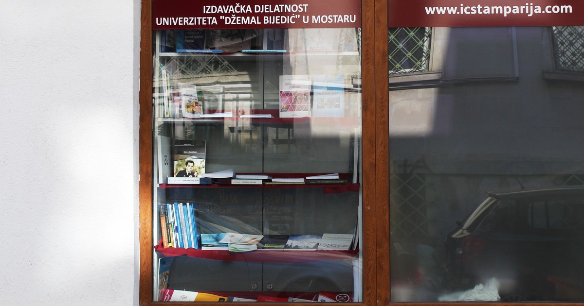 Sa zadovoljstvom vas obavještavamo da je uspostavljen izlog izdavačke djelatnosti Univerziteta "Džemal Bijedić" u Mostaru u sklopu prostorija IC Štamparije na adresi Maršala Tita 96. Trenutno su izložena izdanja publikovana od 2015. godine.
