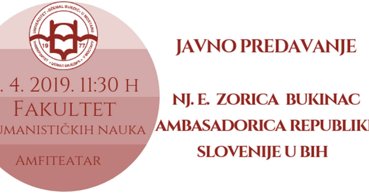 Sa radošću vas pozivamo na javno predavanje Nj.E. Zorice Bukinac, ambasadorice Republike Slovenije u BiH na Univerzitetu "Džemal Bijedić" u Mostaru!