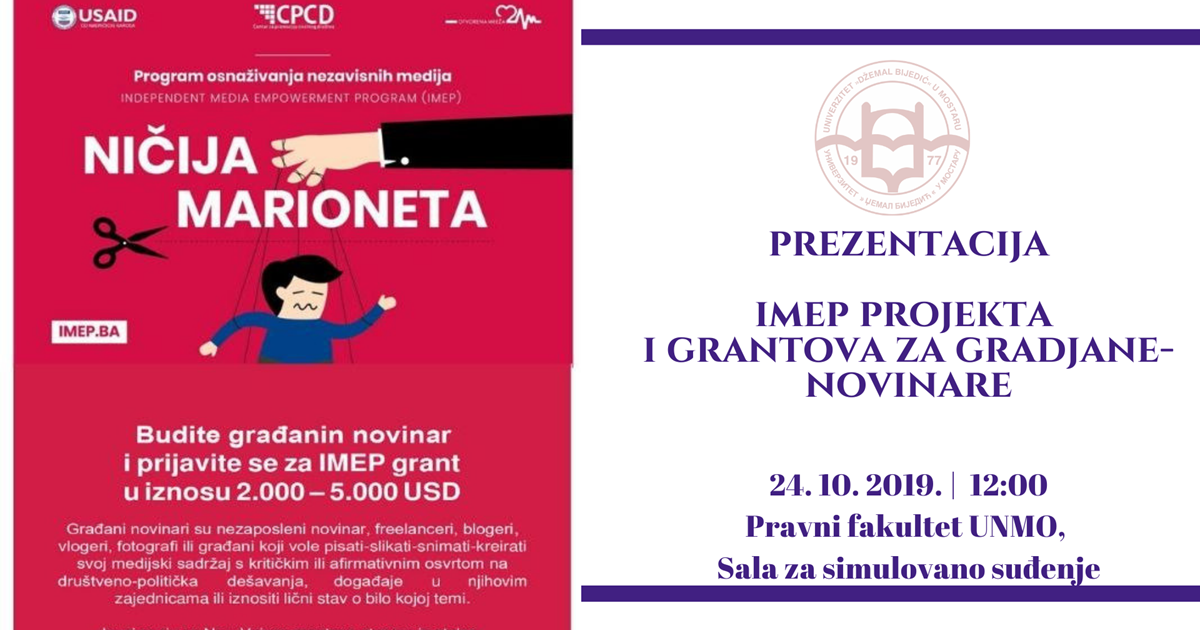 Sa radošću vas pozivamo na prezentaciju Programa osnaživanja nezavisnih medija u BiH (IMEP.BA) i ideje o građanima novinarima koji iz ovog programa mogu dobiti grant za svoje sadržaje - tekstove, video-materijal, filmove, predstave, fotografije.