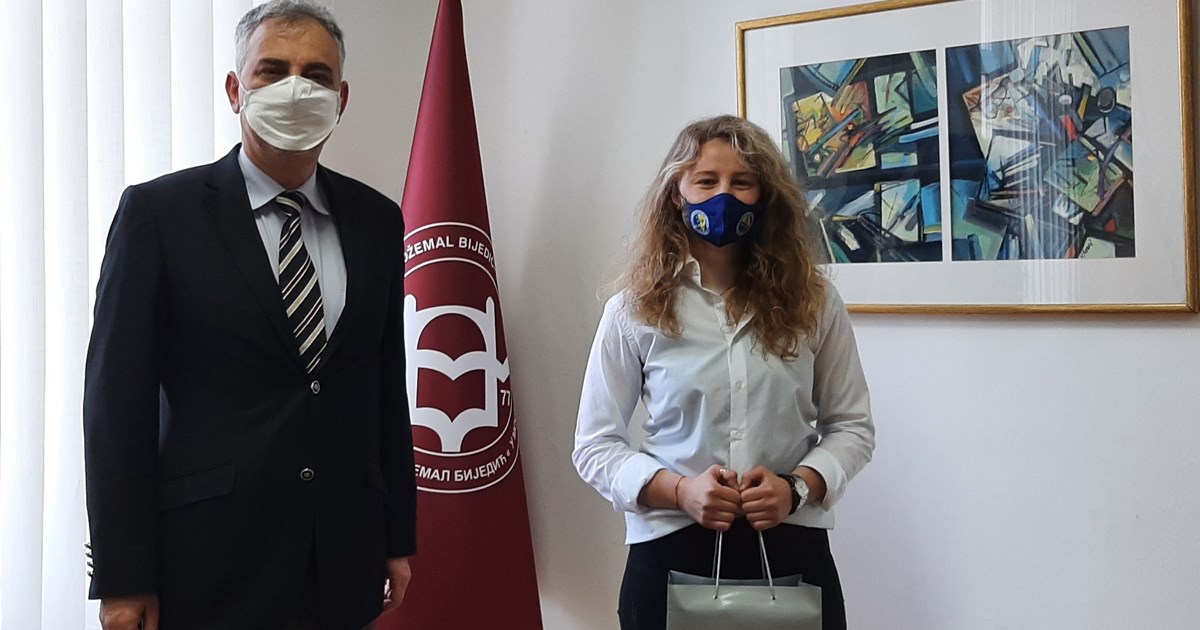 Rektor je danas svečano ugostio reprezentativku ženske rukometne reprezentacije Bosne i Hercegovine, Anisu Selimović, studenticu završne godine Zdravstvene njege na Univerzitetu "Džemal Bijedić" u Mostaru. Anisa iza sebe ima dugogodišnje iskustvo igranja, a trenutno je golmanica rukometnog kluba Hadžići. Reprezentacija se trenutno nalazi u Mostaru na pripremama za predkvalifikacijski turnir koji će se održati u Grčkoj od 4.6.2021-6.6.2021. kao preduslov za odlazak na Euro 2022. Rektor je iskazao podršku reprezentaciji, te poželio uspjeh djevojkama sa željom da se vrate kao pobjednice!
