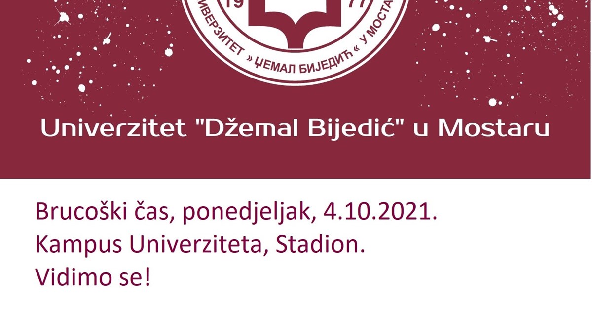 Obavještavamo studente prve godine svih fakulteta i univerzitetskih studija da je Brucoški čas akademske 2021./22. godine zakazan za ponedjeljak, 4.10.2021. godine u 11 sati u kampusu Univerziteta, na stadionu. Želimo Vam uspjeh u novom životnom poglavlju! Sretan početak akademske godine!