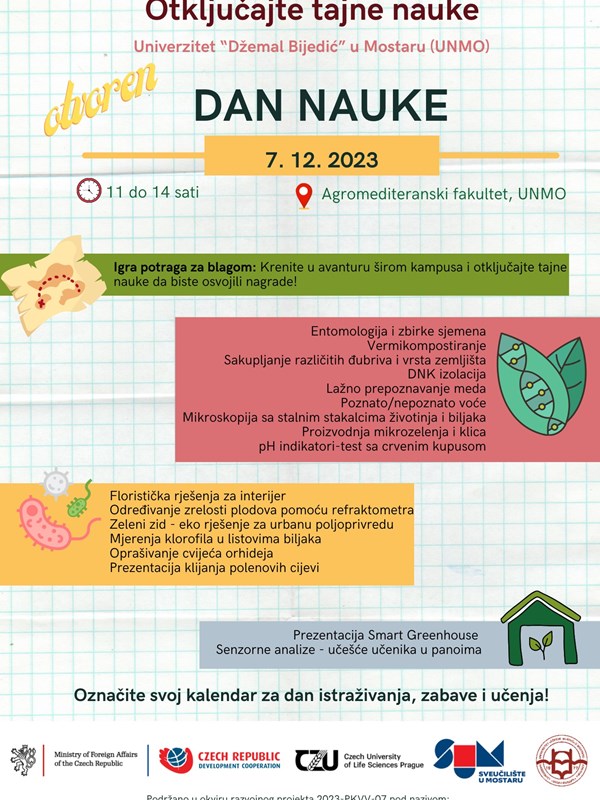 Dan nauke će se također održati i na Prehrambeno-tehnološkom fakultetu Sveučilišta u Mostaru. Događaj se organizuje zajedno sa Fakultetom za tropske studije Univerziteta za životne nauke iz Češke i podržan je od strane Češke razvojne agencije kroz projekt „Support for education and scientific research activities in the field of ethnobotany and the use of by-products of food processing“ (23-PKVV-7).