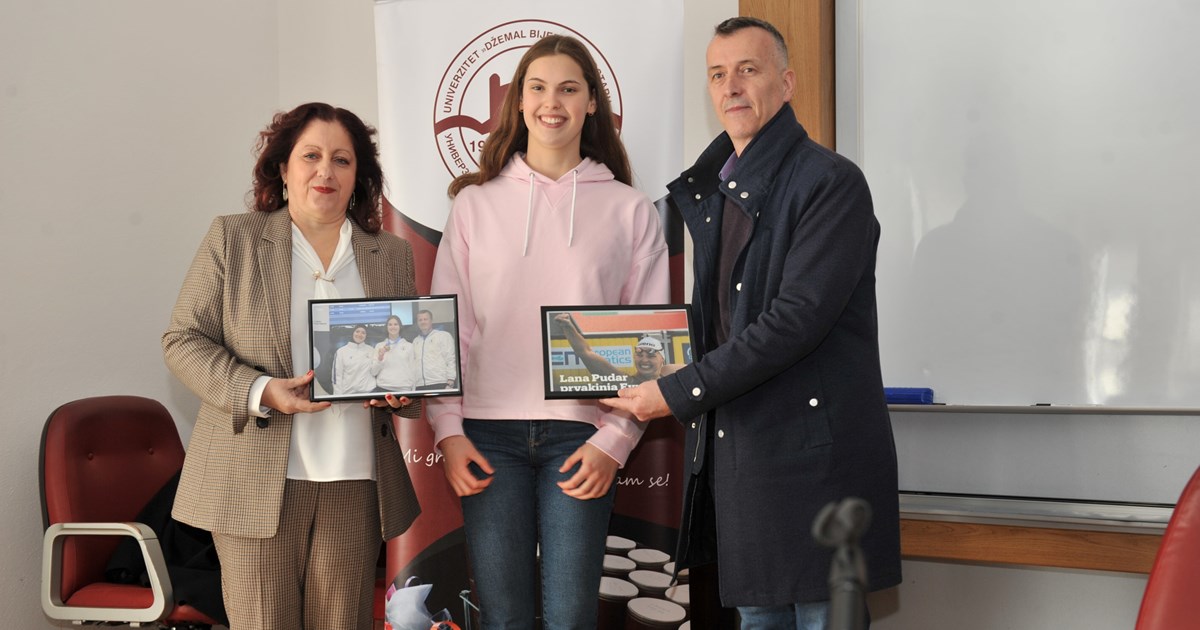 „Našoj zlatnoj plivačici Lani Pudar zahvaljujem na dolasku na Univerzitet „Džemal Bijedić“ u Mostaru povodom obilježavanja 46 godina uspješnog rada i djelovanja Univerziteta. Poznavajući izvrsne rezultate naše zlatne plivačice Lane Pudar, u svoje ime i u ime Univerziteta „Džemal Bijedić“ u Mostaru joj upućujem iskrene čestitke. Znamo da je za ostvarivanje velikih rezultata potreban ogroman trud i zalaganje, ali i talenat kojeg Lana ima u izobilju. Obzirom da je Lana ponos našeg grada i naše domovine, menadžment Univerziteta je odlučio da pored umjetničke slike kao uspomene na današnji dan, Lani poklonimo i besplatno obrazovanje na Univerzitetu „Džemal Bijedić“ u Mostaru na fakultetu ili univerzitetskom studiju na kojem želi da studira“ kazala je rektorica Univerziteta „Džemal Bijedić“ u Mostaru prof. dr. Alena Huseinbegović.