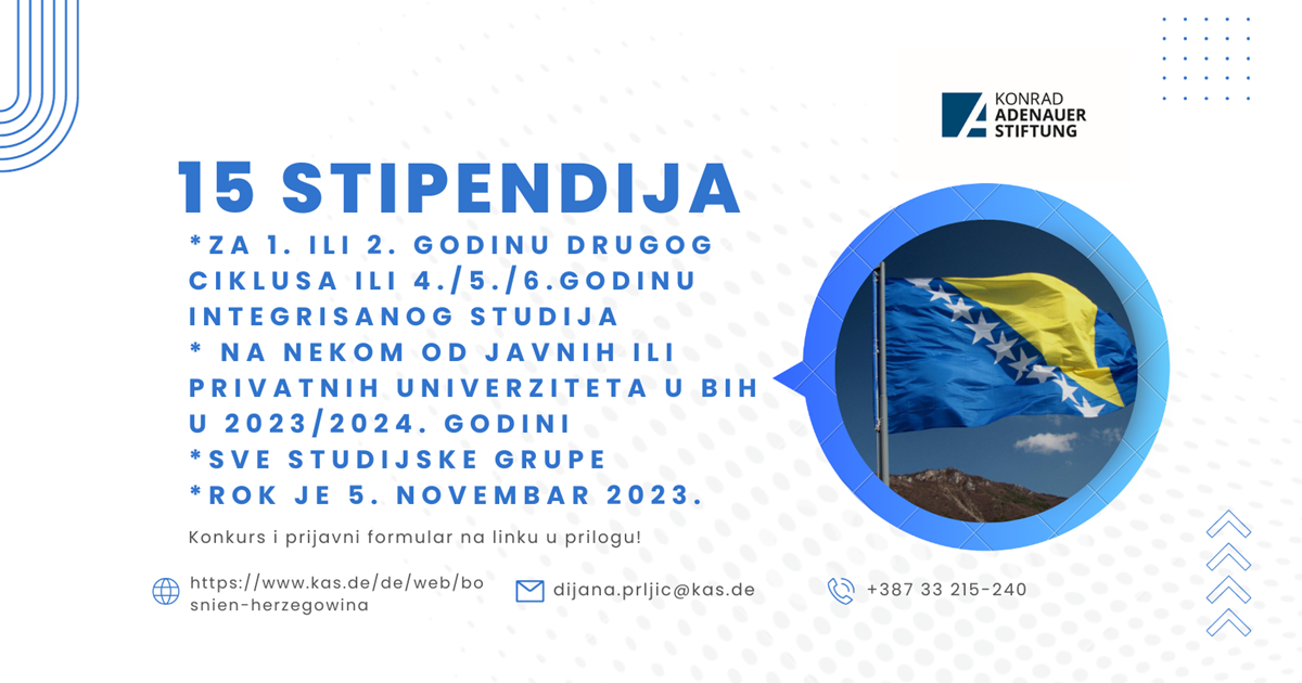 Predstavništvo u Bosni i Hercegovini Fondacije “Konrad Adenauer” raspisalo je konkurs za dodjelu stipendija za studente 1. i 2. godine drugog ciklusa, odnosno od 4. godine naviše integrisanog studija (sve studijske grupe) na nekom od Univerziteta u BiH u akademskoj 2023/24. godini.