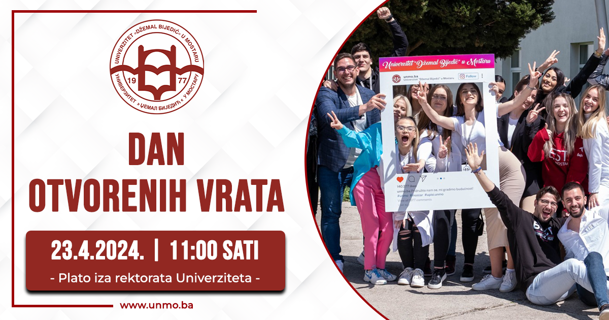 Pozivamo maturante i sve zainteresovane da nam se pridruže na Danu otvorenih vrata, ali i da njihov izbor prilikom nastavka obrazovanja bude Univerzitet „Džemal Bijedić“ u Mostaru na kojem će, uz savremene edukacije, usvojiti naučna i stručna znanja, vještine, iskustva i kompetencije neophodne za konkurentnost na tržištu rada.