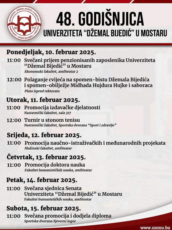 Program obilježavanja važnog jubileja, 48. godišnjice postojanja, rada i djelovanja Univerziteta „Džemal Bijedić“ u Mostaru bit će upriličen u periodu od 10. do 15. februara 2025. godine. U okviru godišnjice Univerziteta bit će upriličene brojne manifestacije koje će okupiti zaposlenike Univerziteta i studente, penzionisane zaposlenike, te goste i zvanice iz akademskog, društvenog i političkog života Bosne i Hercegovine.