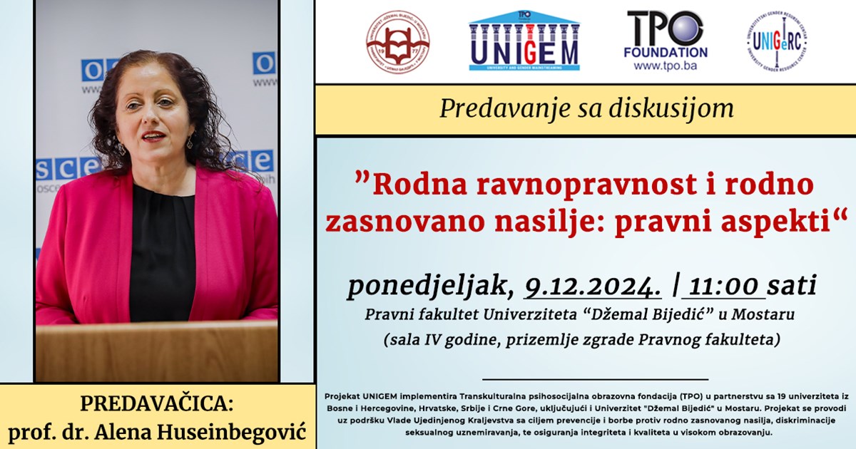 Predavanje “Rodna ravnopravnost i rodno zasnovano nasilje: pravni aspekti " uz diskusiju održala je prof. dr. Alena Huseinbegović, rektorica Univerziteta “Džemal Bijedić” u Mostaru, za studentice i studente, 9.12.2024. godine (ponedjeljak) sa početkom u 11:00 sati na Pravnom fakultetu Univerziteta „Džemal Bijedić“ u Mostaru.