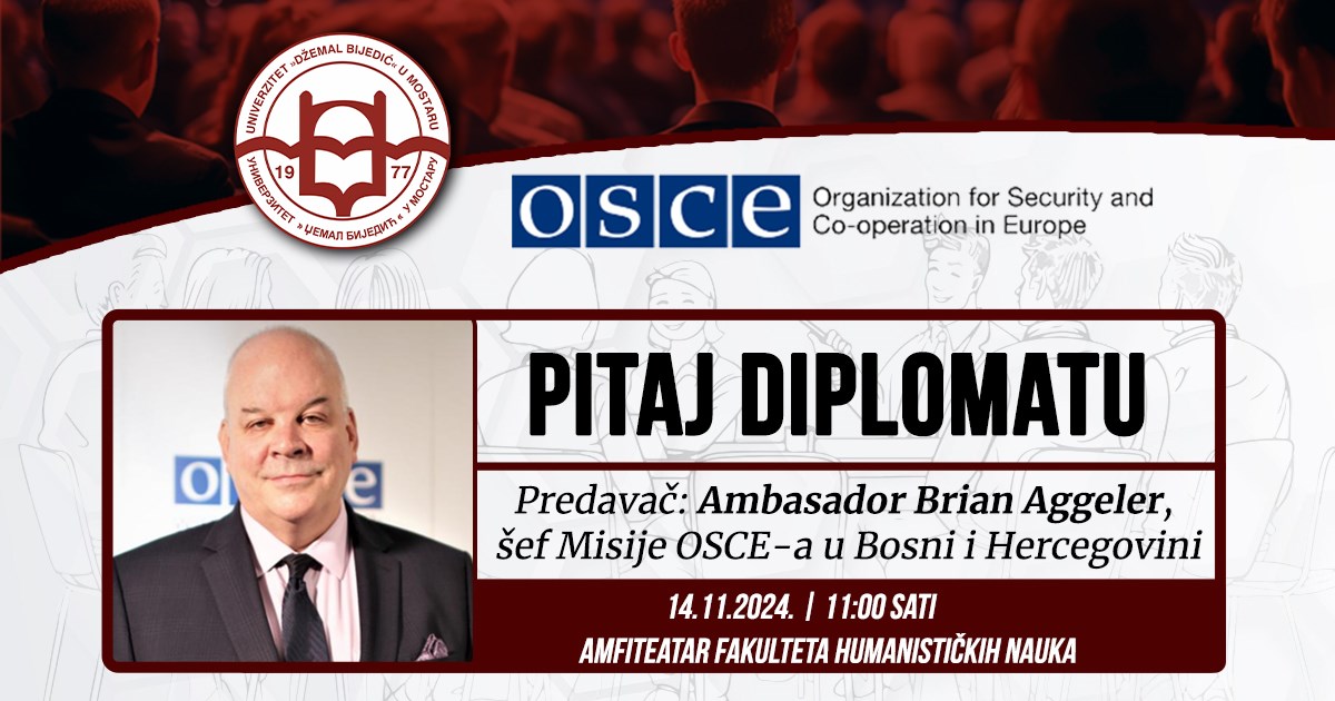 Predavanje će održati ambasador Brian Aggeler šef Misije OSCE-a u Bosni i Hercegovini, koji će sa studentima i pristunim gostima podijeliti svoja iskustva iz oblasti diplomatije i međunarodnih odnosa.